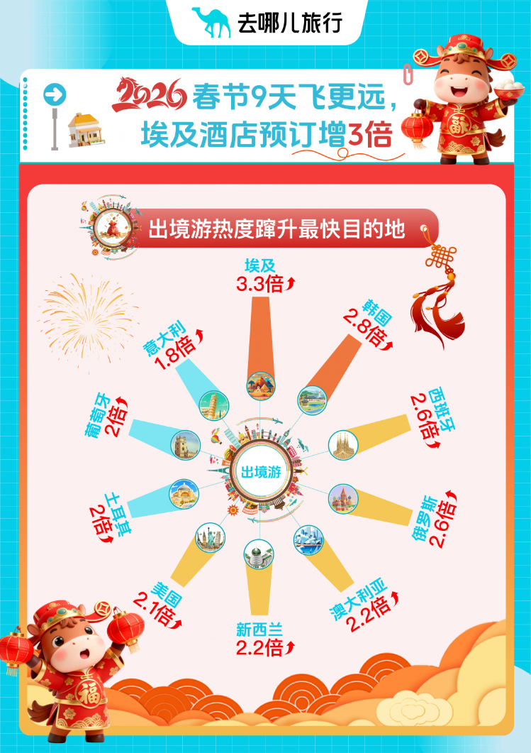 9天长假,“会玩”的人们也走得更远了。2026年春节出国游,长线目的地热度大幅攀升。热度蹿升最快的TOP10目的地中,除韩国外,均为较远目的地。其中,埃及酒店预订量增长3.3倍领跑,西班牙、澳大利亚、土耳其、葡萄牙等长线目的地的酒店预订量也增长超2倍。